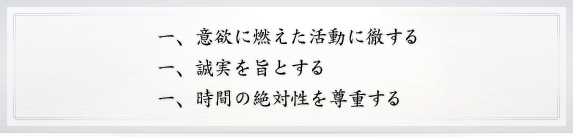 われらはわが社の技術・製品・組織を駆使して産業界の技術革新を促進し、次の三カ条を信条として人類文化の向上に寄与することを誓います。