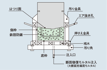 下地処理を行った後型枠を設置し、大断面充填用モルタルをモルタルポンプにて注入充填します。大断面充填用モルタルの特長は、高強度・高流動性・ノンブリージング・低発熱性・ひびわれ抵抗性・高遮塩性等です。特にアルカリ骨材反応によって劣化したコンクリートについては、アルカリ骨材反応制御型モルタルを使用します。