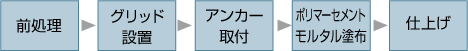 FRP格子筋補強工法は、カーボン、アミラド、ガラス等の高性能連続強化繊維を樹脂に含浸させながら一体成形したFRP格子筋を、補強するコンクリート構造物の表面に特殊アンカーにて取り付けた後、専用ポリマーセメントモルタルを規定の厚さに吹き付けや金ゴテにて仕上げる補強工法です。その優れた性能は、橋梁床版のB活荷重補強をはじめ、コンクリート構造物の補修・補強に採用されています。